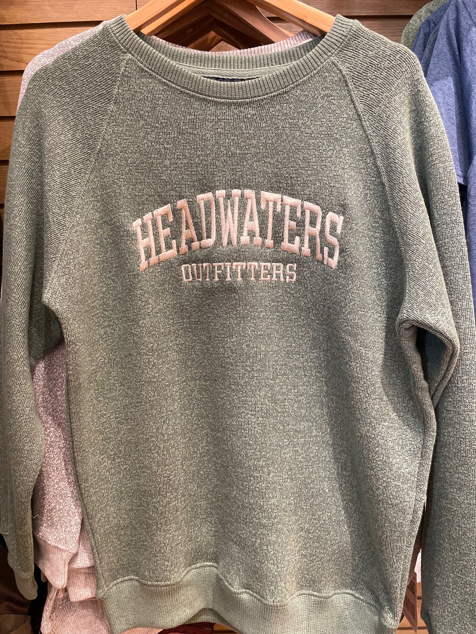 Soft knitted cotton/poly blend crew neck sweathshirt with embroidered Headwaters logo.