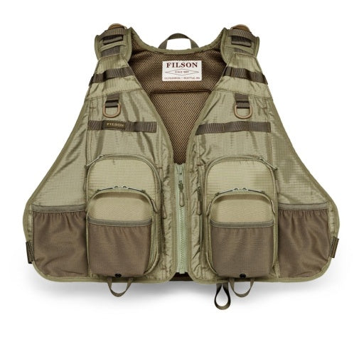 High-capacity fishing vest engineered for easy access to gear with maximum breathability and mobility. Large vertical flybox pockets with fold-down pocket/trays with foam fly-holder inserts. Rear zippered and flapped pockets, side water-bottle pockets and exterior rod loops and D-rings. Adjustable shoulder and waist straps; breathable-mesh back and shoulders; zip-front closure. 500D ripstop nylon + polyester mesh + polyethylene foam + ABS plastic. Imported.