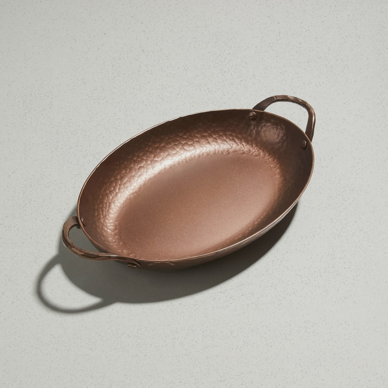 Hand-forged and limited in nature, each oval roaster is visually unique while sharing fundamental design elements, including hand hammered handles with a texture designed for easy gripping and a beautiful pre-seasoned interior finish. With performance that rivals cast iron at a lighter weight, these roasters are both functional and beautiful workhorses for your kitchen. Perfect for roast chicken and vegetables, grilled fish, baked gratins, and much more.